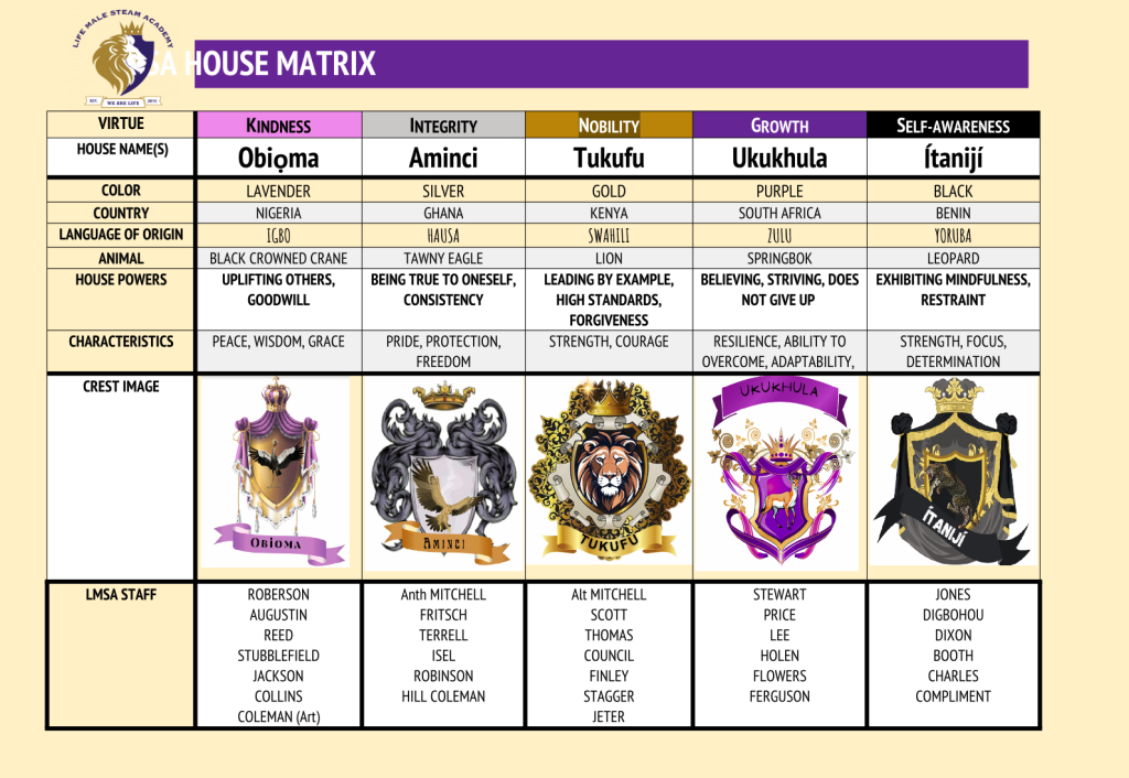 Scholars are placed into Houses that promote school spirit, teamwork, and core values through monthly competitions and community challenges. (Houses: Kindness, Integrity, Nobility, Growth, and Self-Awareness)